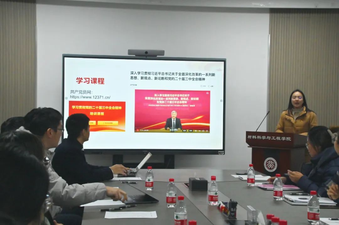 在会议室,双方党支部进行了深入的交流与研讨。首先,北京大学材料科学与工程学院新兴材料党支部莫凡洋书记对我们的到来表示热烈欢迎,希望本次共建活动能够促进双方沟通,更好地贯彻党的二十届三中全会精神,落实深化改革。接下来,第二党支部书记杨超杰老师根据共产党员网提供的培训课程带领老师们一起深入学习贯彻习近平总书记关于全面深化改革的一系列新思想、新观点、新论断和党的二十届三中全会精神。与会党员教师们认真聆听,展现出高度的学习热情和积极的参与态度。
