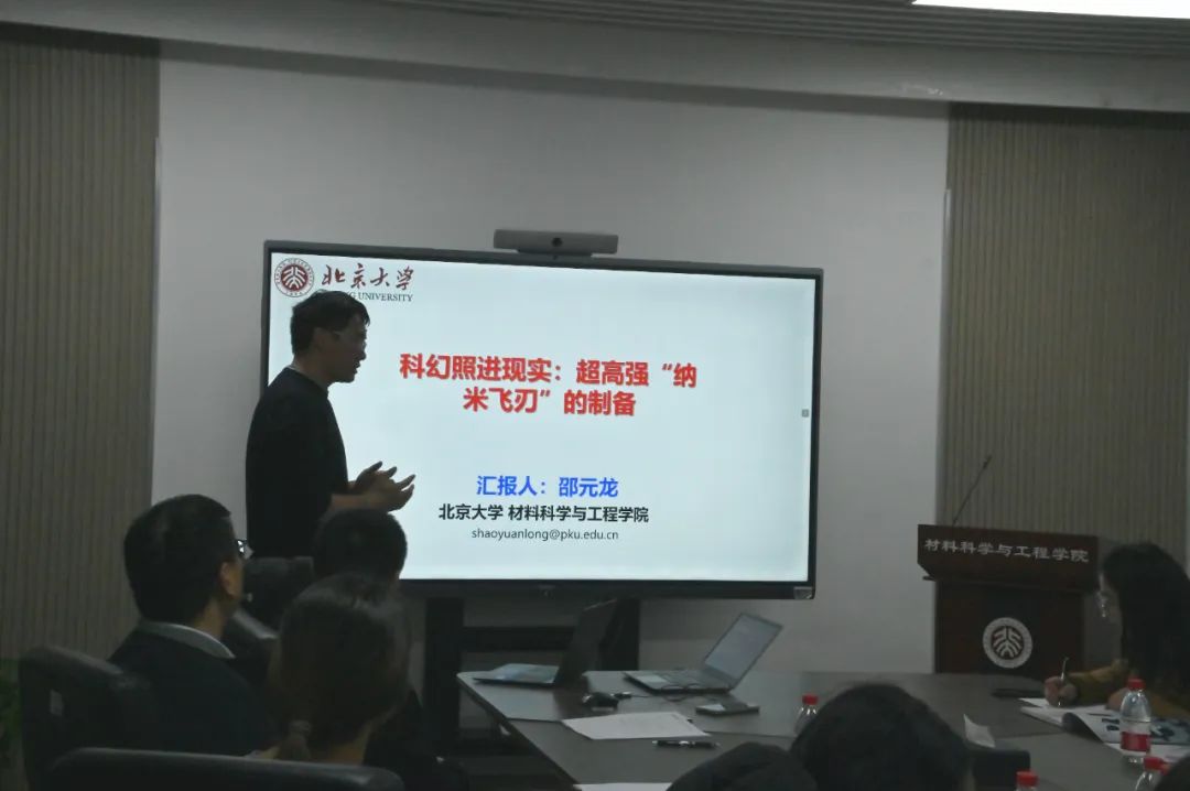 活动中,北京大学材料科学与工程学院研究员邵元龙老师带来了一场题为《科幻照进现实:超高强“纳米飞刃”的制备》的精彩报告。邵老师以《三体》片段为导入,生动讲述了纤维纺织与人类社会的紧密联系,介绍了我国纤维纺织行业的现状与发展前景,并特别介绍了碳纳米管纤维这一新型材料在未来智能服装、国家战略新兴产业中的关键作用。党员教师们听后受益匪浅,对北大新兴材料党支部党员教师的创新敬业精神及优秀成果表示钦佩。