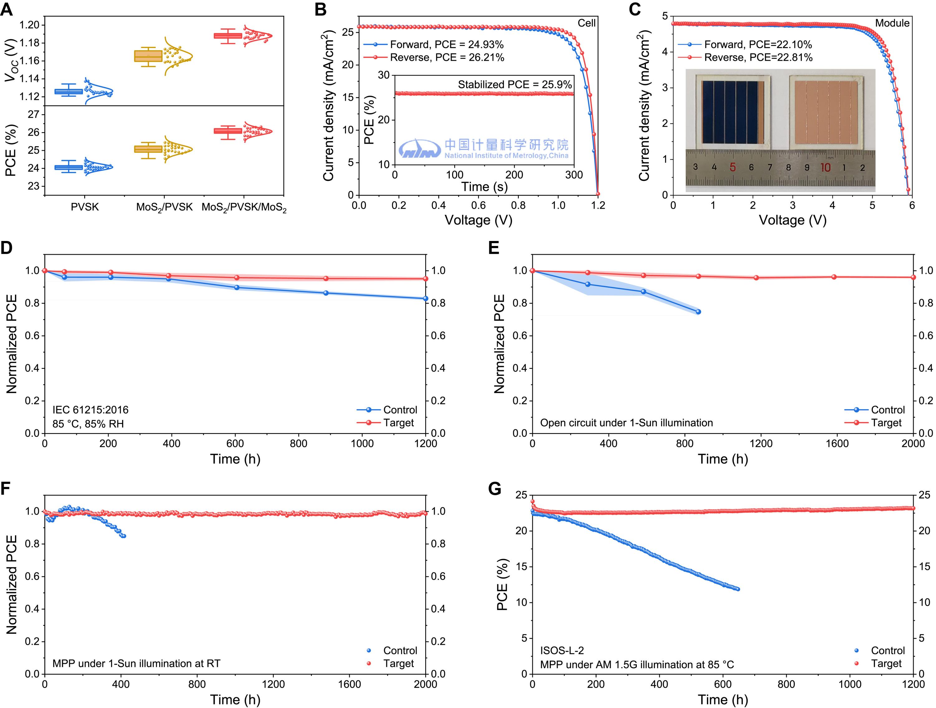 因此,基于MoS2/钙钛矿/MoS2结构的钙钛矿太阳能电池和组件分别实现了高达26.2%(认证稳态效率为25.9%)和22.8%的光电转换效率。此外,电池表现出卓越的湿热稳定性(在85℃和85%相对湿度下老化1200小时后保留初始效率的95%)、光照稳定性(在连续一个太阳照射下在开路状态下老化2000小时后保留初始效率的96.6%)和运行稳定性(在室温下连续一个太阳照射下在最大功率点跟踪2000小时后效率基本没有衰减,在85℃下连续一个太阳照射下在最大功率点跟踪1200小时后保留初始效率的96%,这是迄今为止报道的最稳定的钙钛矿太阳能电池之一)。本研究通过界面工程搭建了二维材料和软晶格光电材料的桥梁,为提高钙钛矿基光电器件的性能提供了实用框架,并可以扩展到其他相关领域高效稳定器件的构建。