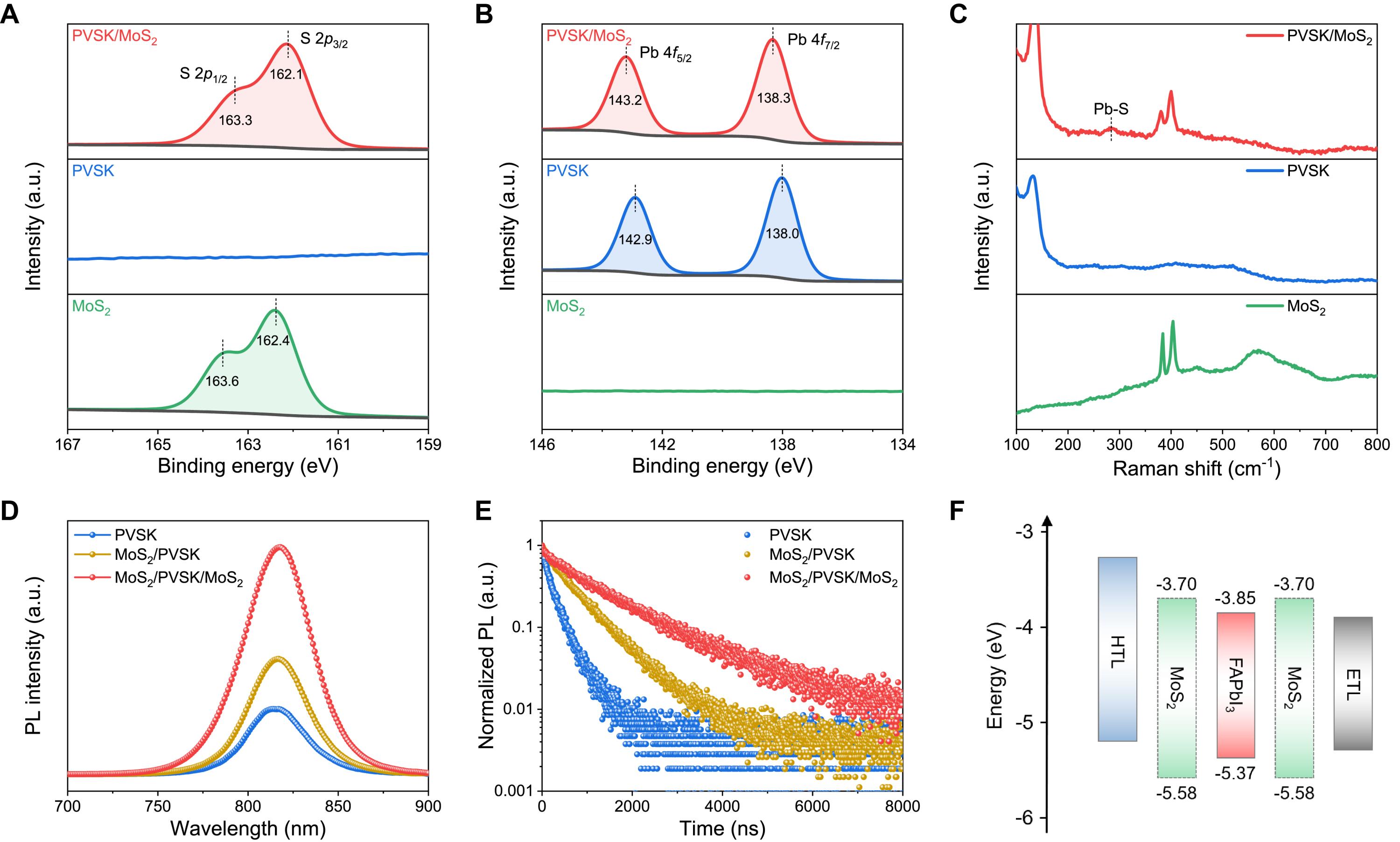 图2.构型表征。(A−C)MoS2、钙钛矿、钙钛矿/MoS2薄膜的XPS(A、B)和拉曼光谱(C)。(D、E)钙钛矿、MoS2/钙钛矿、MoS2/钙钛矿/MoS2薄膜的PL光谱(D)和TRPL衰减曲线(E)。(F)钙钛矿和单层MoS2之间的能级排列。