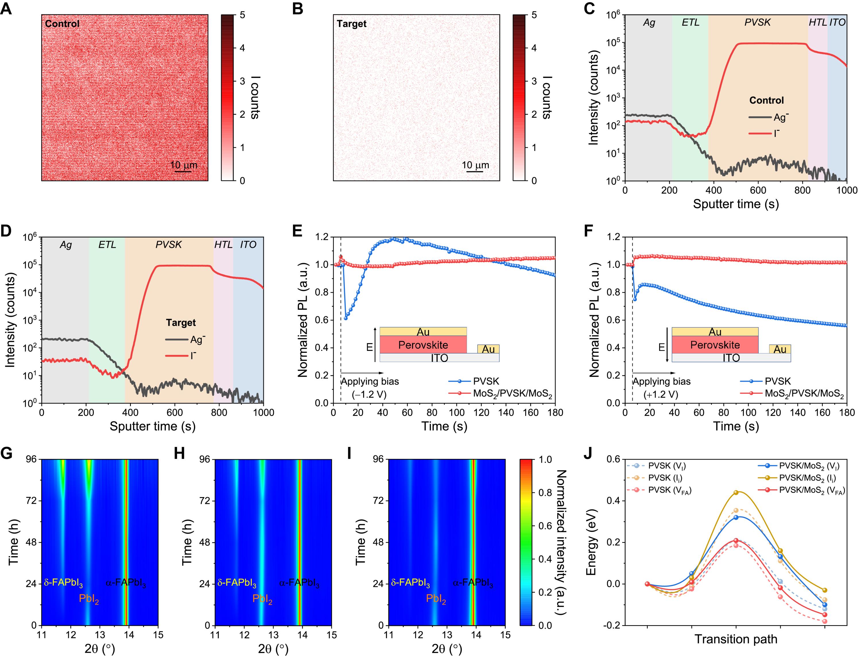 图1.稳定的构型。(A、B)ITO/FAPbI3/Ag(A)和ITO/FAPbI3/MoS2/Ag(B)器件老化后Ag电极上I信号的ToF-SIMS映射。(C、D)不同构型的电池老化后的ToF-SIMS深度剖面图。(E、F)−1.2 V(E)和+1.2 V(F)偏压下ITO/FAPbI3/Au和ITO/MoS2/FAPbI3/MoS2/Au器件的时间分辨PL强度。(G−I)钙钛矿(G)、MoS2/钙钛矿(H)、MoS2/钙钛矿/MoS2(I)薄膜在85%相对湿度下老化时的XRD图谱演变。(J)无MoS2钝化和有MoS2钝化的钙钛矿的相变能量曲线。