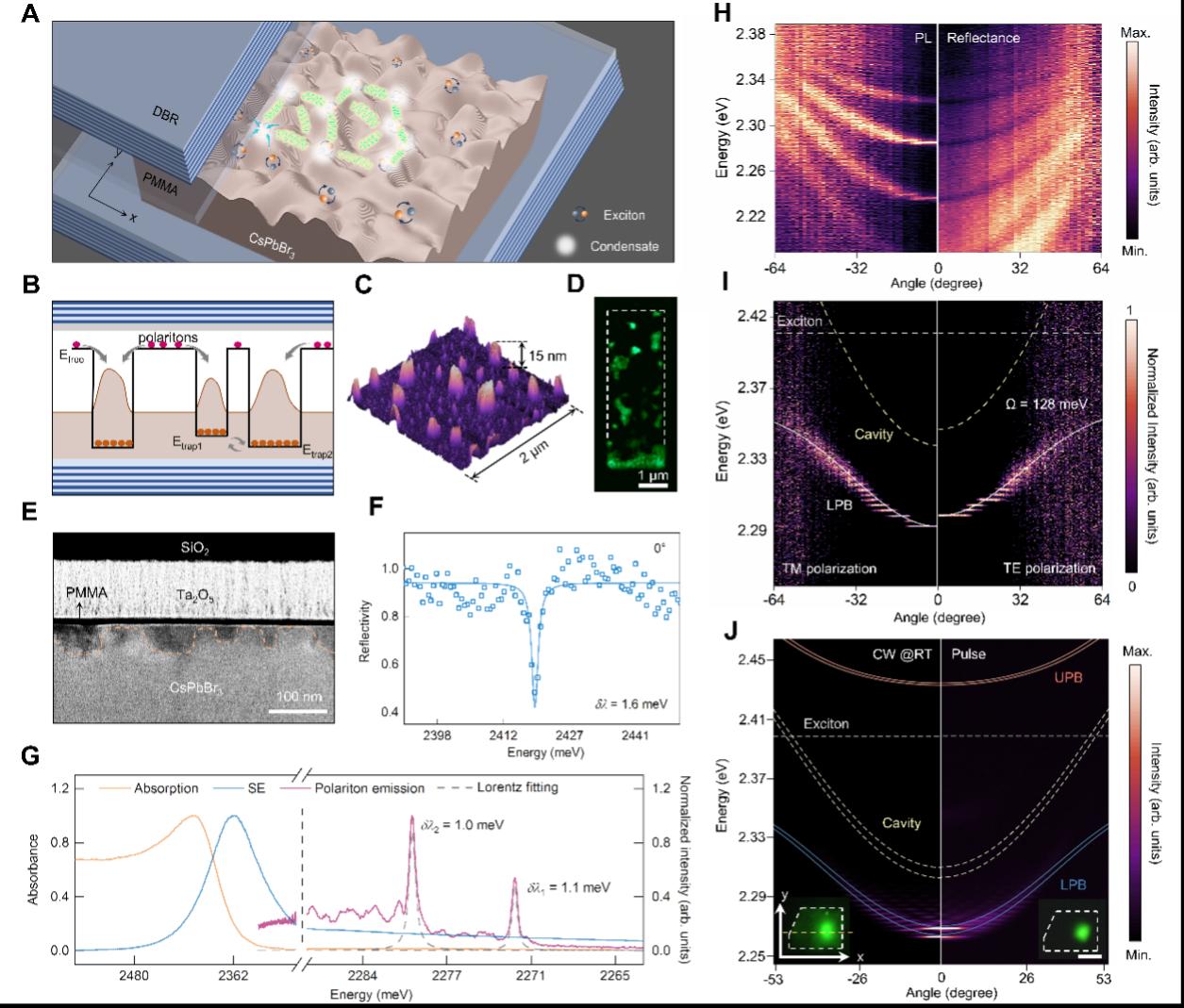 该研究首先制备CsPbBr3半导体单晶,并采用聚二甲基硅氧烷(PDMS)印章将其转移至底层分布式布拉格反射镜(DBR)上,随后旋涂聚甲基丙烯酸甲酯(PMMA)间隔层,再沉积顶部DBR以构建微腔(图1A-1B)。在PDMS干法转移过程中单晶表面形成了10纳米左右起伏的表面结构,作为能够捕获极化激元的势阱结构(图1C-1E)。光谱表征发现空腔品质因子达1512(图1F),与激子耦合后通过角分辨反射和荧光光谱观察到高角度下的反交叉特性(图1G-1I),确认了室温下激子−光子强耦合的存在,并基于耦合谐振子模型拟合得到拉比劈裂能Ω为128 meV。在非共振连续光泵浦条件下,微腔的发射特征与脉冲光泵浦激子极化激元凝聚的发射特征一致(图1J)。