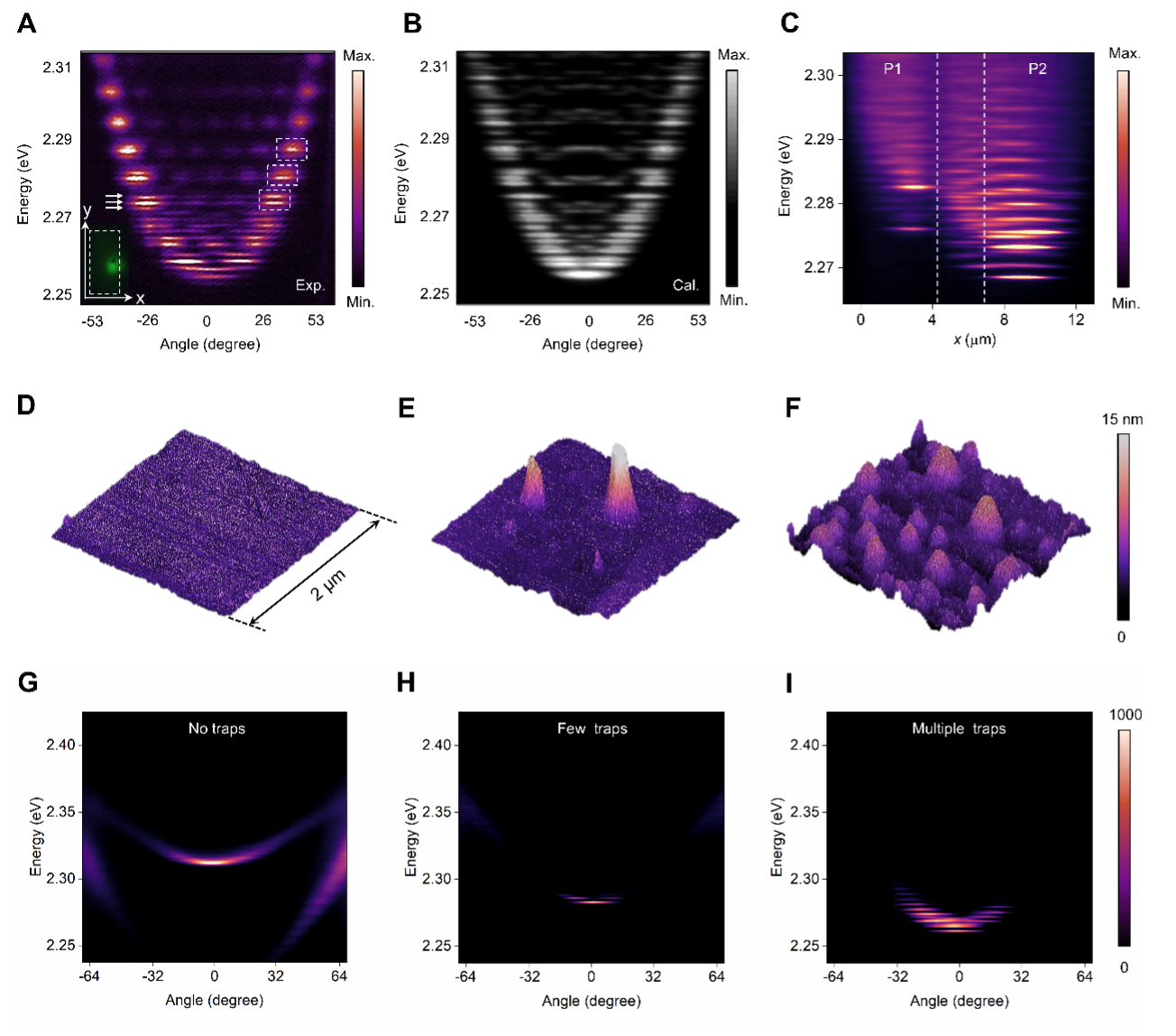 图4.势阱调控极化激元凝聚体发射。(A)微腔沿短边方向TM偏振下的角分辨荧光光谱;(B)基于双势阱模型计算所得角分辨荧光光谱;(C)空间分辨荧光光谱;(D-F)无势阱、少势阱和多势阱半导体表面原子力显微三维形貌;(G-I)对应于(D-F)的角分辨荧光光谱。