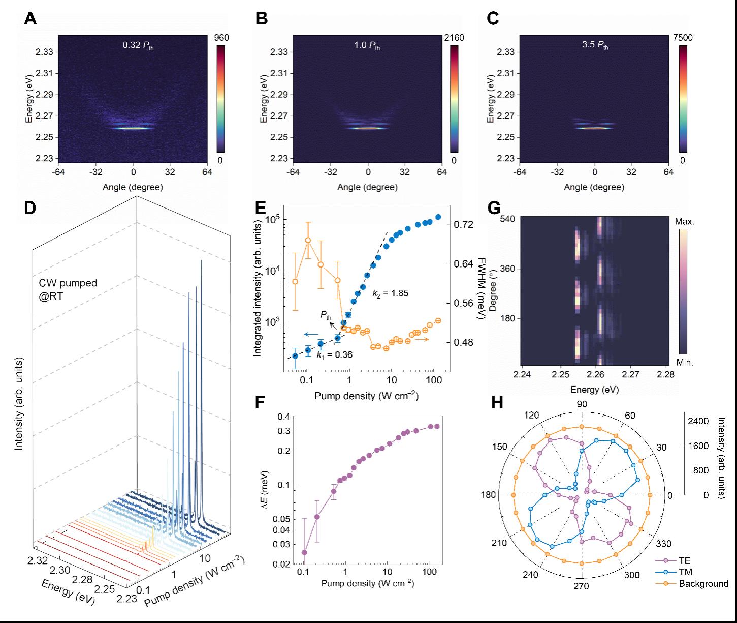 图2.室温连续光泵浦极化激元凝聚。(A-C)非共振连续光泵浦下角分辨荧光光谱,泵浦密度分别为0.3Pth,1.0Pth和3.5Pth;(D)0°方向发射光谱随泵浦密度演化;(E)凝聚态能量区间内荧光积分强度与线宽随泵浦密度的变化特征;(F)LPB基态峰位蓝移量随泵浦密度的变化特征;(G-H)极化激元凝聚发射的二维伪彩色及极坐标分布图。