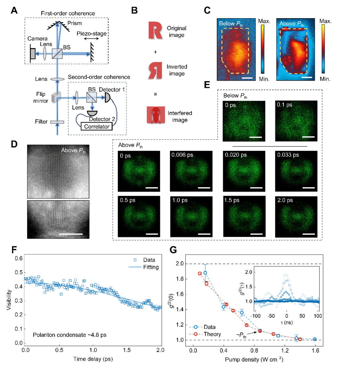 图3.极化激元凝聚态时空相干性表征。(A)一阶/二阶相干性测量装置示意图;(B)镜像对称干涉图像示意图;(C)凝聚态与非凝聚态实空间图像;(D)凝聚态Michelson干涉图像;(E)凝聚态Michelson干涉图像;(F)干涉条纹可见度随时间延迟的变化;(G)g(2)(0)值随泵浦密度变化规律。