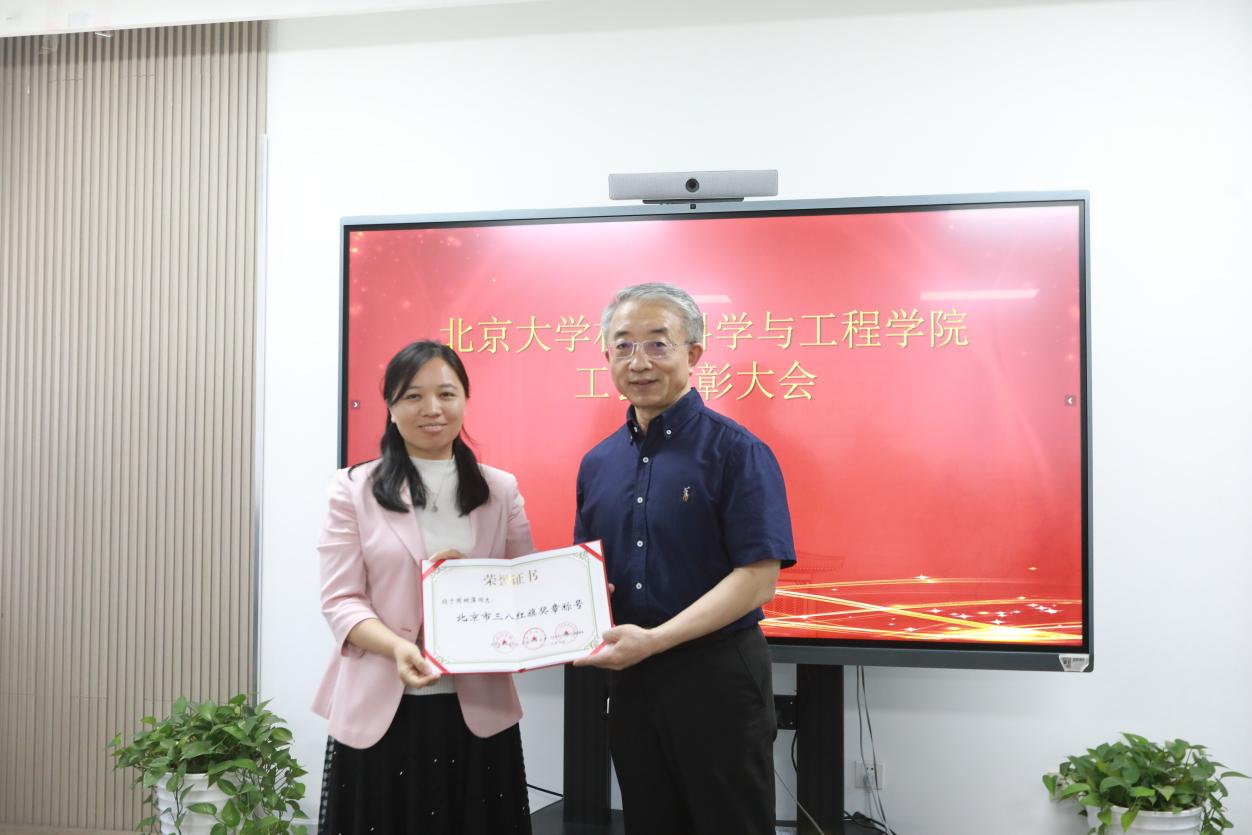 致辞后,安钰峰及校工会代表为周欢萍颁发北京市三八红旗奖章,为材料与工程学院工会颁发北京大学先进工会委员会证书,为郭少军颁发北京大学模范工会主席证书。