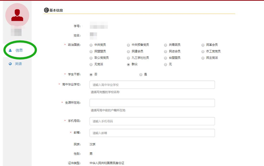 此前未在该系统登陆填写过个人信息的同学,登陆后会自动跳到个人信息填写,请先完善个人信息。(此前登陆并填写过的同学,请直接跳转到下一步。)此部分信息分为“信息”和“英语” 两部分,均需要填写;
