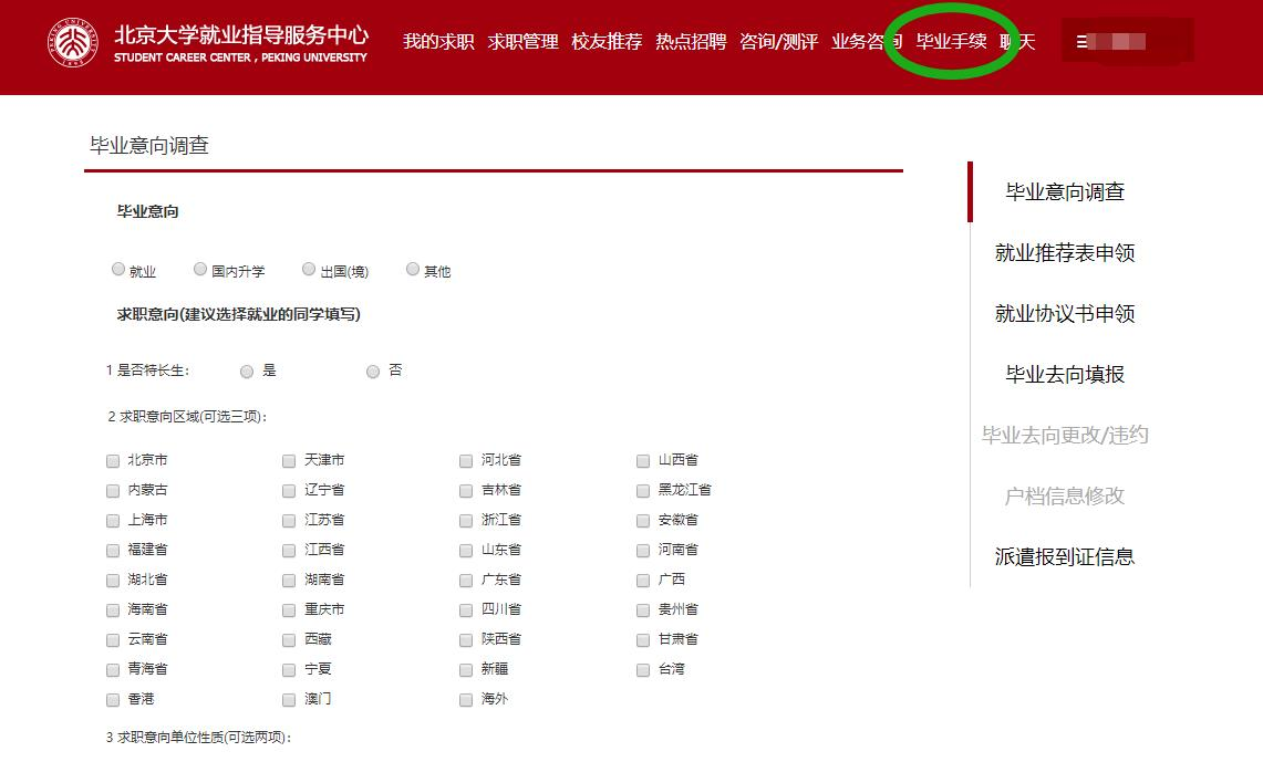 填写好个人信息后,点击上方菜单栏的“毕业手续”,进入下一页面;