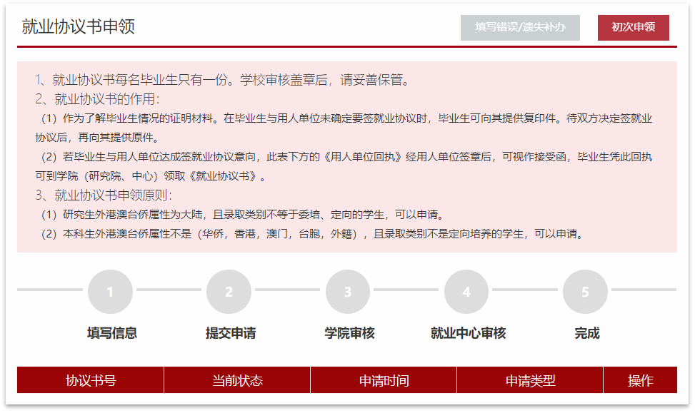 点击“就业协议书申领”,“初次申领”进入页面,信息填写完整后,点击“提交”。