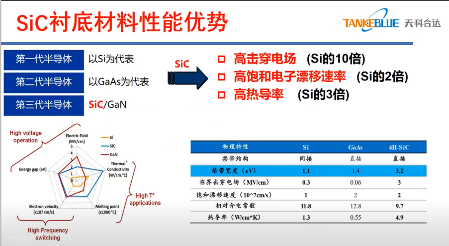 随后,赵宁详细介绍了第三代半导体SiC的相关进展及关键技术。SiC具有高击穿电场、高饱和电子漂移率和高热导率的性能优势,适用于高温、高压、高频领域。这些特性可以降低器件导通电阻,无拖尾电流,减小系统体积,从而能够大大降低能耗。目前主要有导电型和半绝缘型两种SiC单晶衬底,在光伏、轨道交通、新能源汽车等众多领域具有广阔的应用前景。SiC材料作为重要基础材料,其发展也得到许多有利于第三半导体发展的政策支持。目前,SiC材料的产业链已基本形成,逐步成为落实双碳战略目标的基础保障。