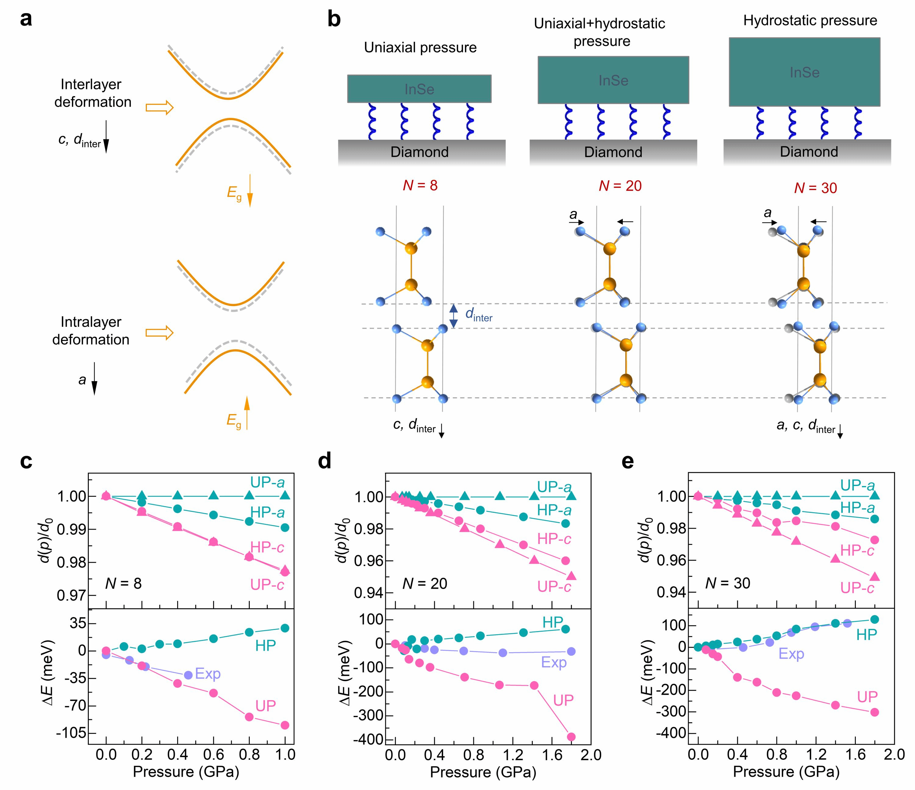 结合第一性原理计算,揭示InSe在静水压作用下随层厚依赖的晶格形变和电子带隙演化机制(图2):当N= 5−15,由于InSe/金刚石界面的粘附力大于层内压缩力,产生单轴应变,层间压缩占据主导,使得电子带隙减小;当N= 15−20,随着层数N增加,层内压缩力逐渐抵消粘附力,使得压力环境同时兼有单轴压力和静水压的特征;当N= 20−30,层内压缩力完全超过粘附力,静水压占据主导地位,层内压缩导致电子带隙增加。