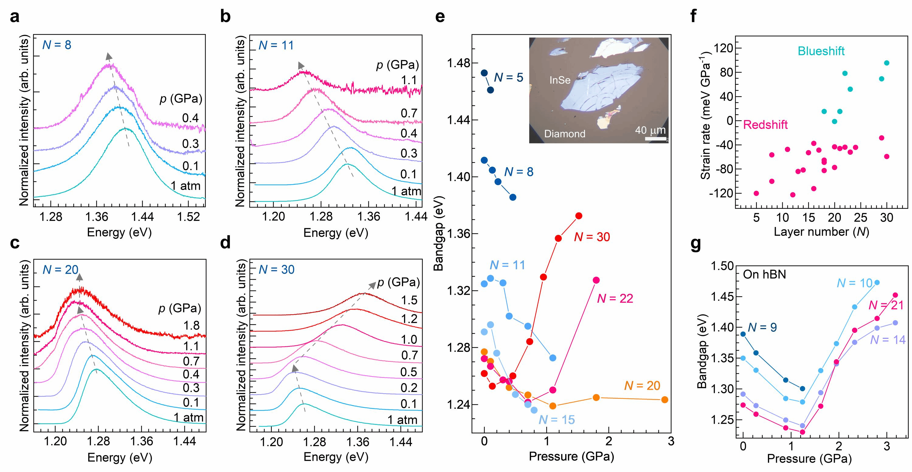 图1:不同层数InSe薄片的压力依赖荧光光谱。