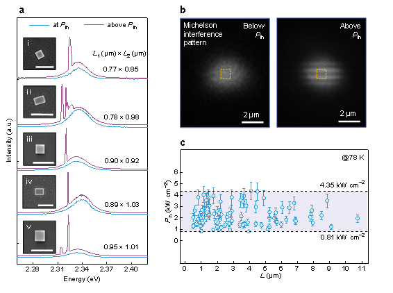 该工作利用化学气相沉积法在蓝宝石衬底上制备了全无机钙钛矿CsPbBr3单晶微米片,观察到室温下钙钛矿激子与回音壁微腔光子发生强耦合,形成激子极化激元。通过发射强度从线性到非线性变化、线宽变窄、发射偏振转变和阈值处空间相干性转变等一系列证据,证实了亚微米尺寸CsPbBr3单晶片的连续光泵浦荧光激射,其器件面积最低至0.65 μm2。同时发现,亚微米激光光源的阈值与大尺寸激光光源相当,甚至可以更低(图1)。