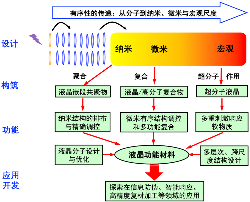 于海峰课题组多年来一直从事液晶与高分子相关的智能材料方面的研究工作。通过研究光与物质的相互作用,提出了“液晶分子设计与优化”和“多层次、跨尺度结构设计”的关键技术,以聚合、复合及超分子组装等方式设计和构筑具有有序结构和优异性能的液晶/高分子功能材料,系统研究了结构调控及其在外场(如光、热、机械力等)作用下的性能优化规律,实现微纳结构的精准定制。在此基础上,开发这些材料在多重信息防伪、智能粘接、精确驱动与控制等领域、高性能与高精度复材制品等领域的应用。主要目前的主要研究集中在: